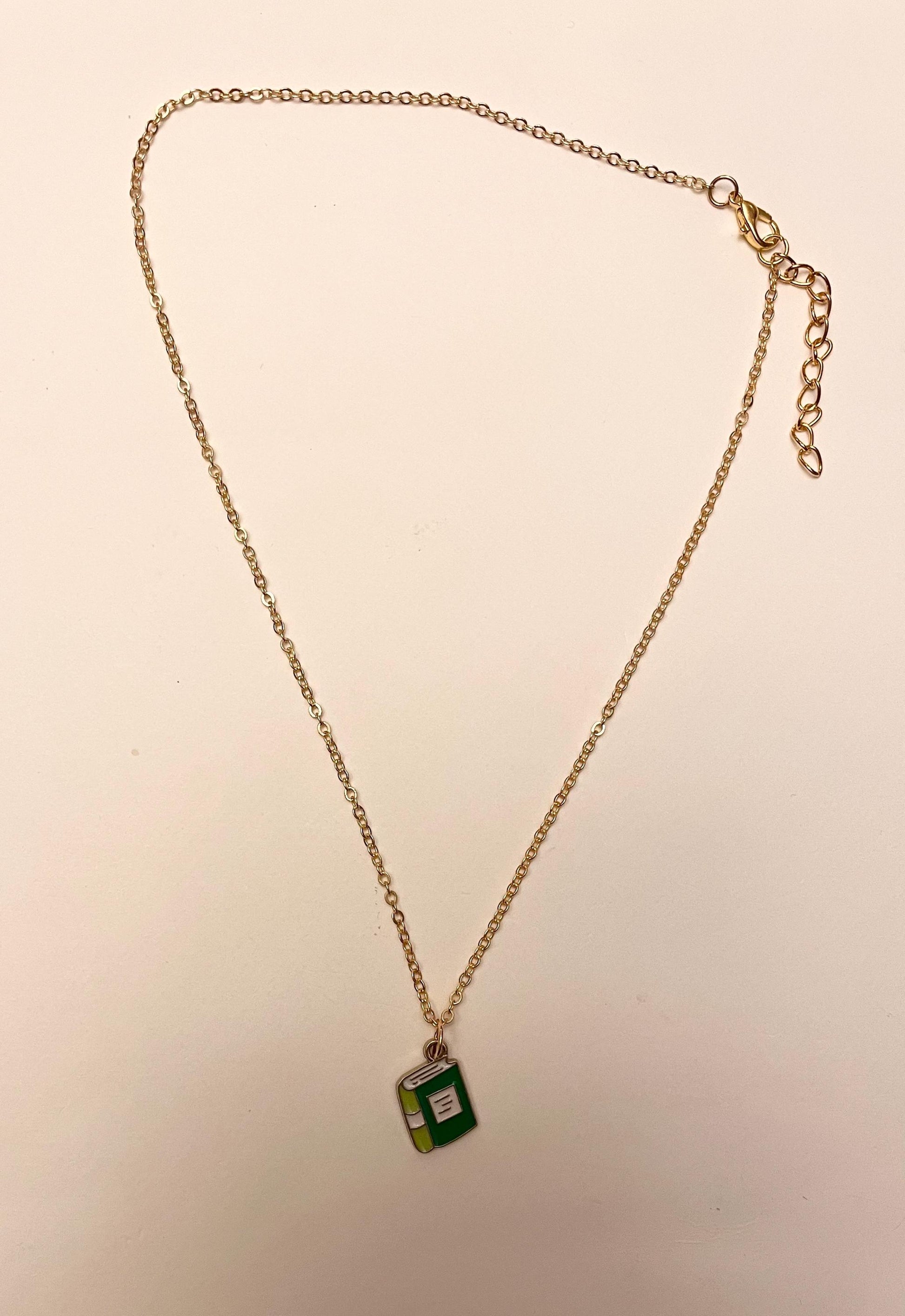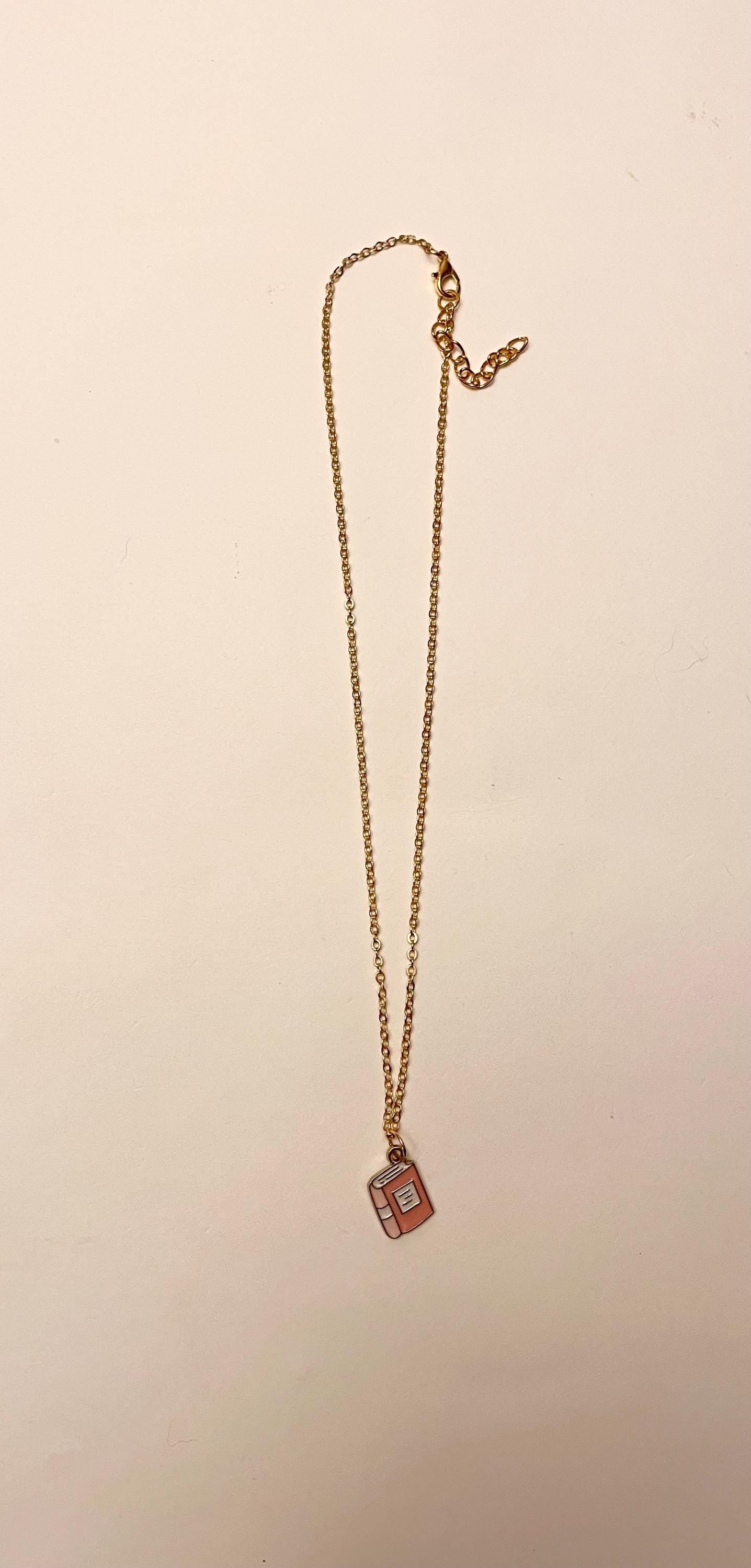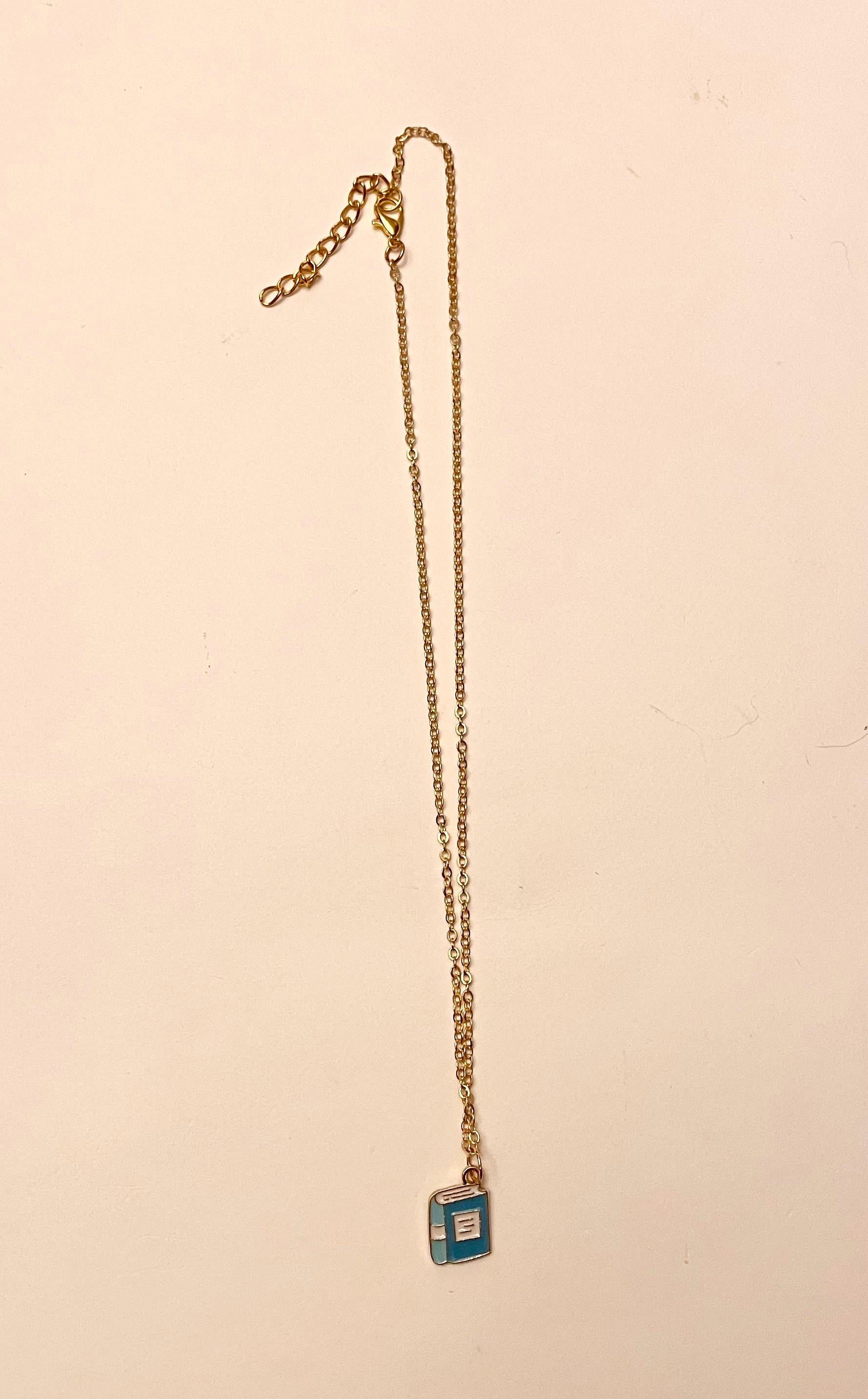 A cute enamel pendant in the shape of a book. Attached to a gold imitation chain, adjustable 40-45 centimeters. The pendant measures approximately 1 x 1,4 centimeters. The necklace is secured with a lobster clasp. Choose between a pink, blue or green book.